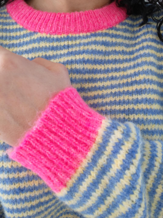 Rayures bleue et jaune, col et bout des manches rose fluo